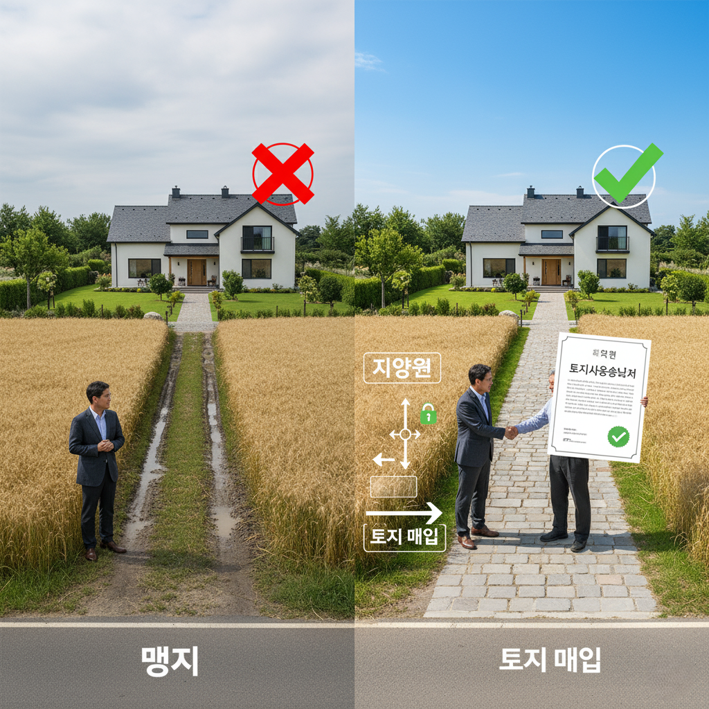 내 땅에 길이 없다면? 건축 허가가 불가능한 맹지일 수 있습니다. 도로 지분을 확보하거나, 토지사용승낙서를 받는 등 맹지를 가치 있는 땅으로 만드는 현실적인 해결책을 제시합니다.토지를 소유하고 있거나 매입을 고려할 때, 가장 중요하게 확인해야 할 것 중 하나가 바로 '도로'입니다. 아무리 위치가 좋고 풍경이 뛰어나도, 그 땅이 도로에 접해있지 않다면 가치가 크게 떨어질 수밖에 없습니다. 특히 전원주택 단지 등에서 '도로 지분'이 없다는 말을 듣고 당황하는 경우가 많습니다. 이는 곧 내 땅이 건축법상 도로에 닿아있지 않은 '맹지(盲地)'일 수 있다는 신호입니다.도로 지분 없는 땅 맹지의 의미건축법에서는 건축물의 대지는 반드시 폭 4미터 이상의 도로에 2미터 이상 접해야 한다고 규정하고 있습니다. 이는 화재..
